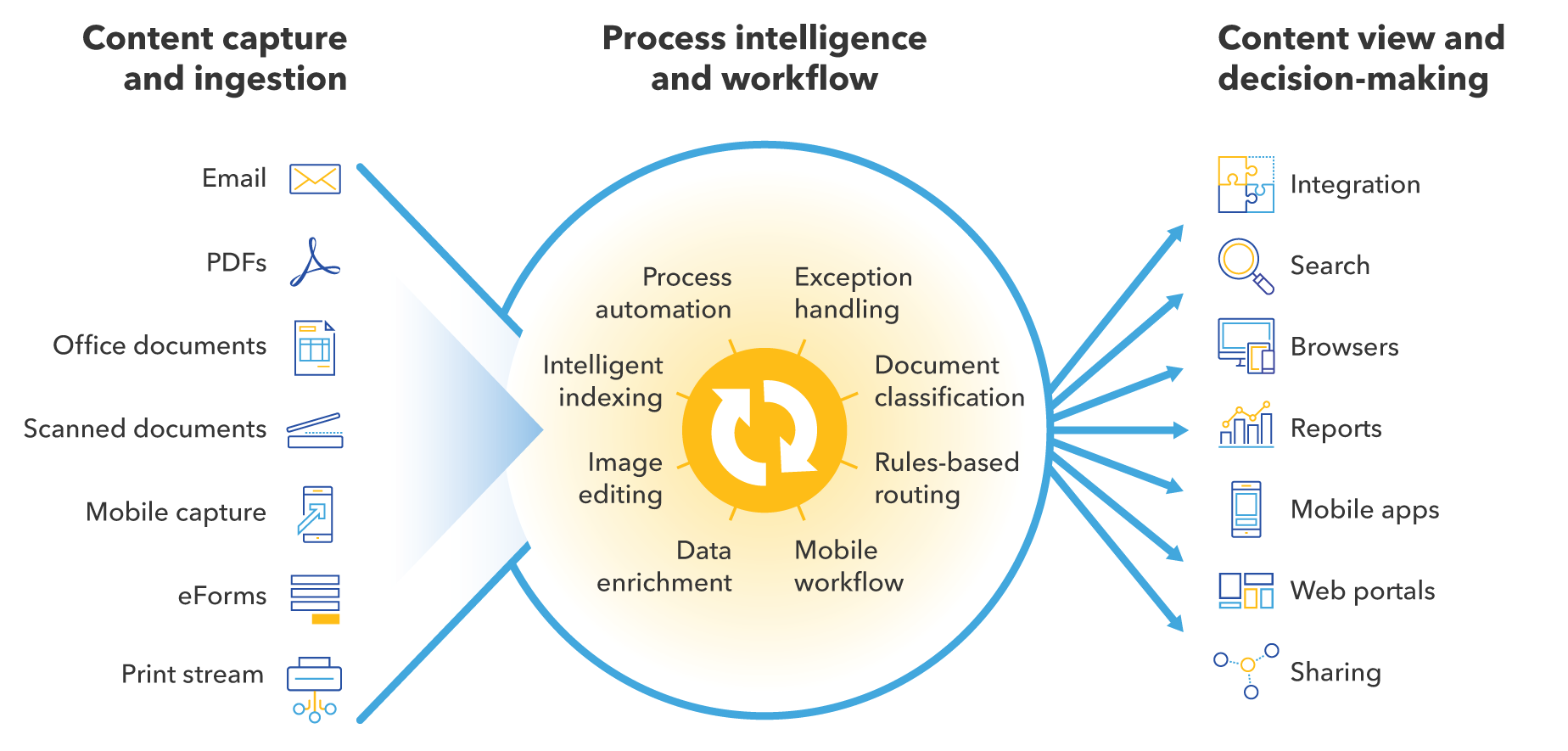 Entrada automática de documentos de scanners, pastas ou aplicações, com indexação imediata.