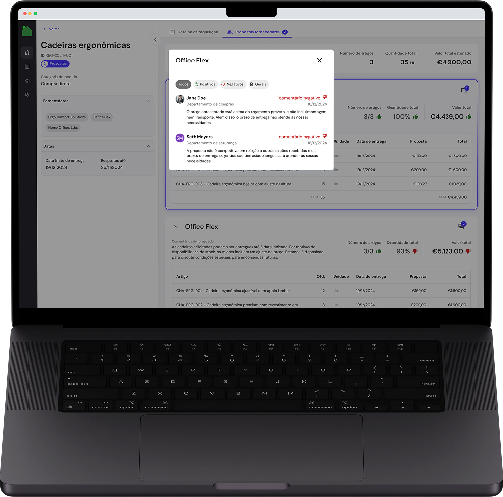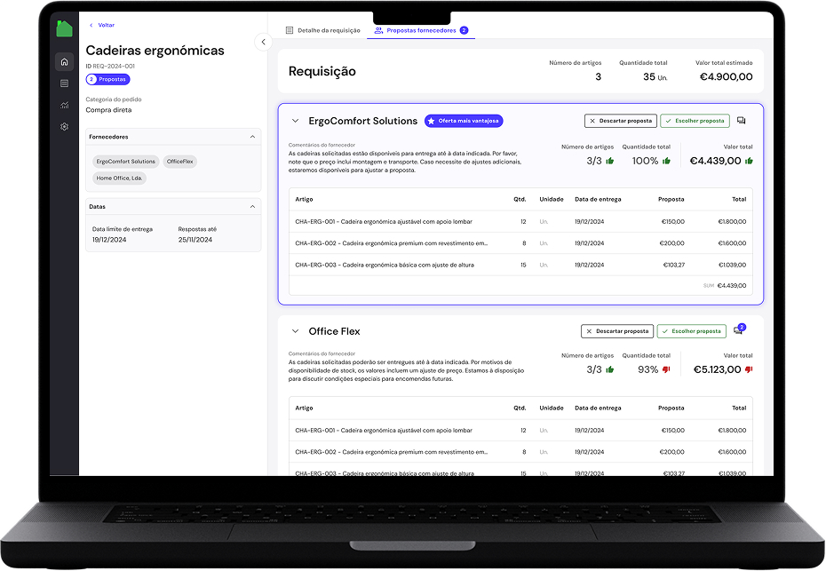 • Histórico detalhado de pedidos e propostas por fornecedor.